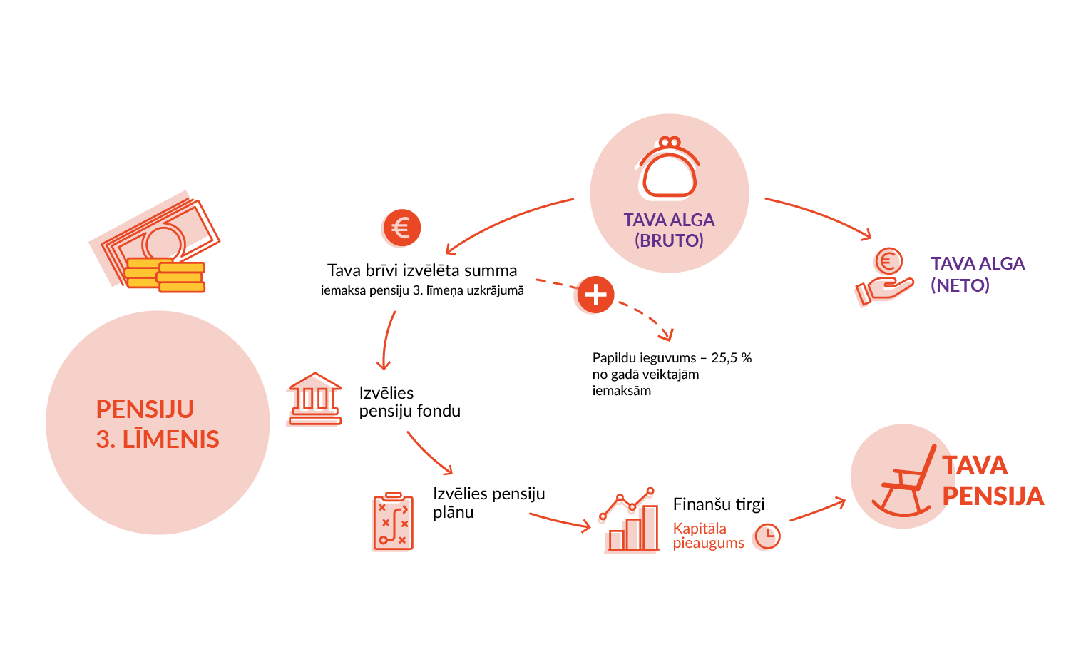 Tavs pensiju 3. līmeņa uzkrājums būs atkarīgs no:- regularitātes, veikto iemaksu lieluma. Iemaksas var sākt veikt jau no pirmā eiro. Pieslēdz regulāras iemaksas algas saņemšanas dienā, lai pensiju uzkrājums veidotos automātiski.